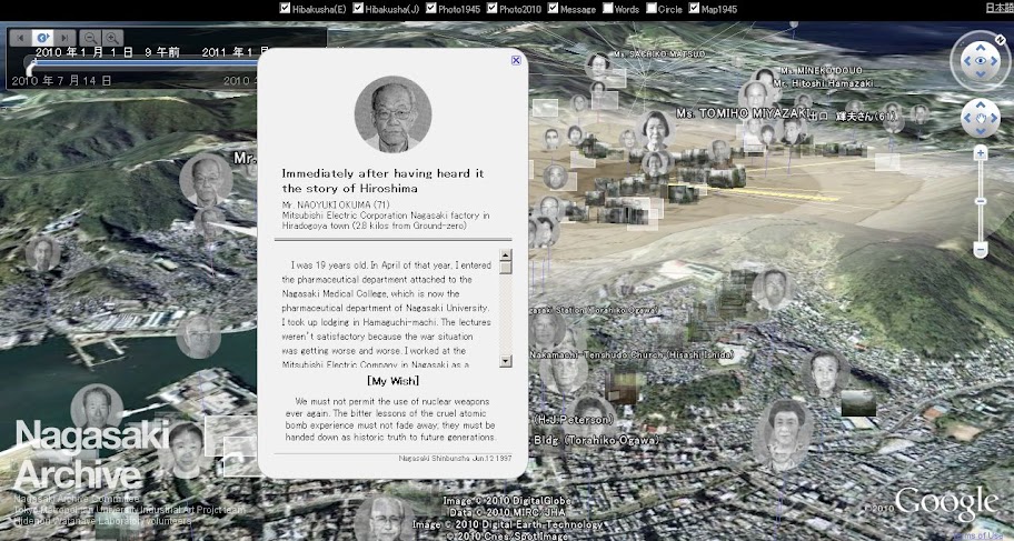 À l'occasion du 65ème anniversaire (drôle de terme, mais bon..) du largage de Fat Man sur Nagasaki, Nagasaki Archive a mis en ligne un dossier très complet qui utilise le plugiciel Google Earth Plugin